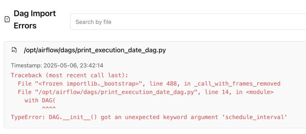 There isn’t anything wrong with the code above. However, the DAG itself wasn’t compatible with Airflow 3.0. When you put this file in the DAG folder and let Airflow 3.0 parse it, you will see the following errors.