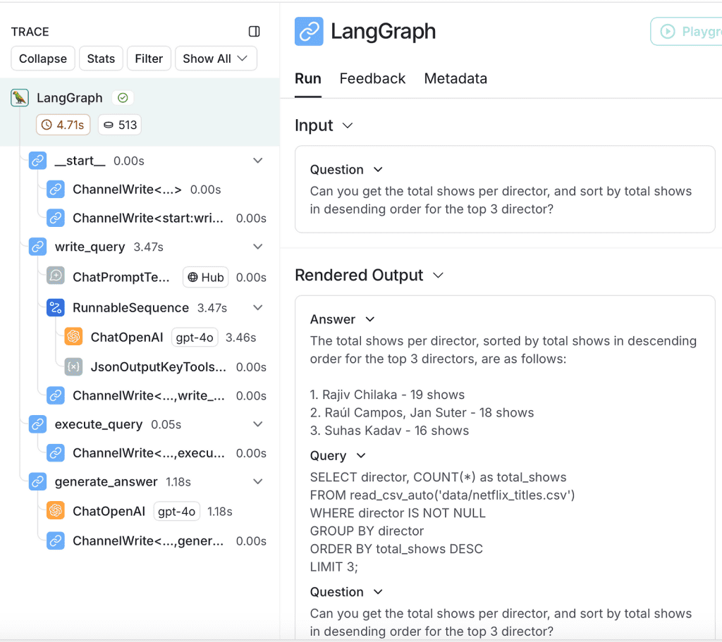 By following all three steps, we will be able to create a reliable AI agent that can assist in addressing business inquiries without the need for a knowledge of SQL syntax. Here is the peak of the output for the three steps mentioned above.