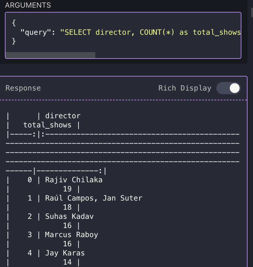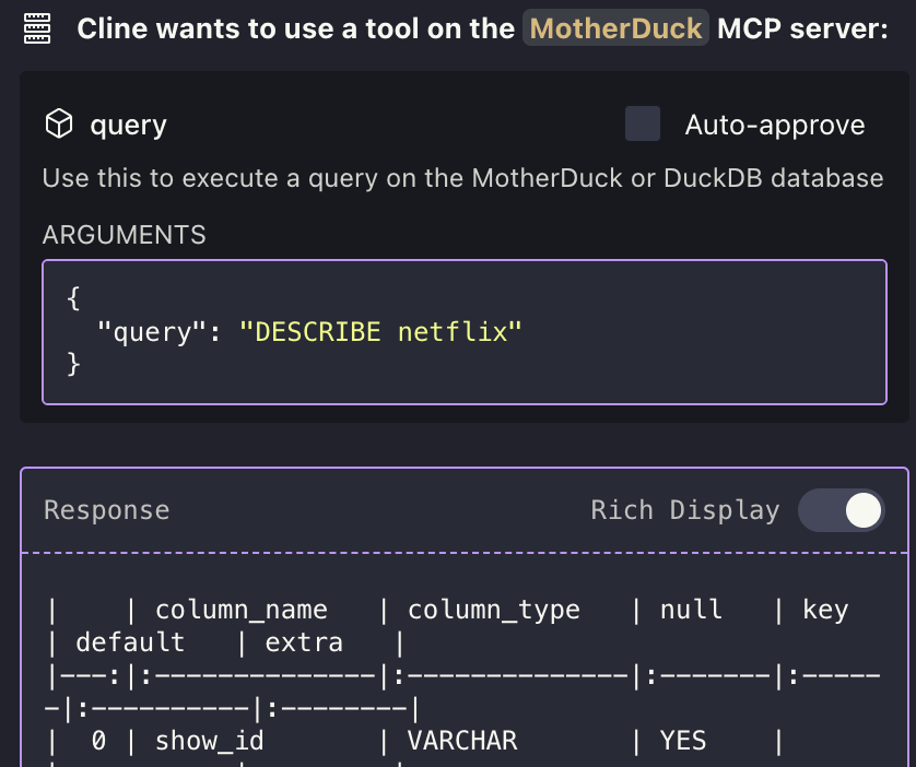 get total number of shows by each director Cline will automatically call DuckDB MCP and load the proper function for our goal, then it will load data into DuckDB and then generate a query to fetch the result.