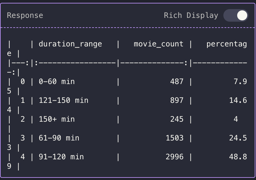 WHERE duration_minutes IS NOT NULLGROUP BY duration_rangeORDER BY duration_range
