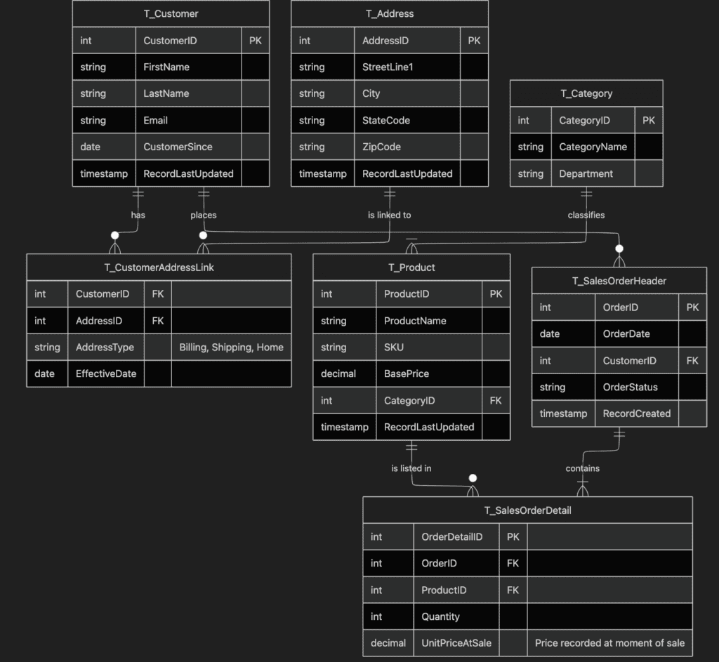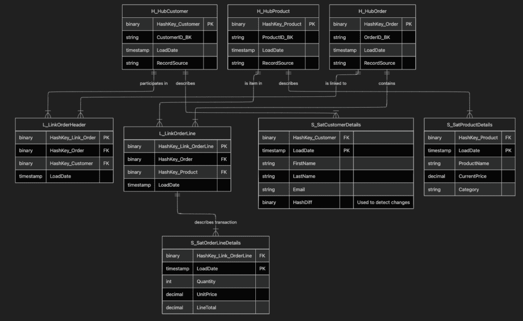 The golden rule of Data Vault is we never delete. We just insert new rows. If a customer changes their address, we don’t overwrite the old one (like Inmon) or wrestle with complex updates (like Kimball). We just insert a new row in a “Satellite” table with a new timestamp.