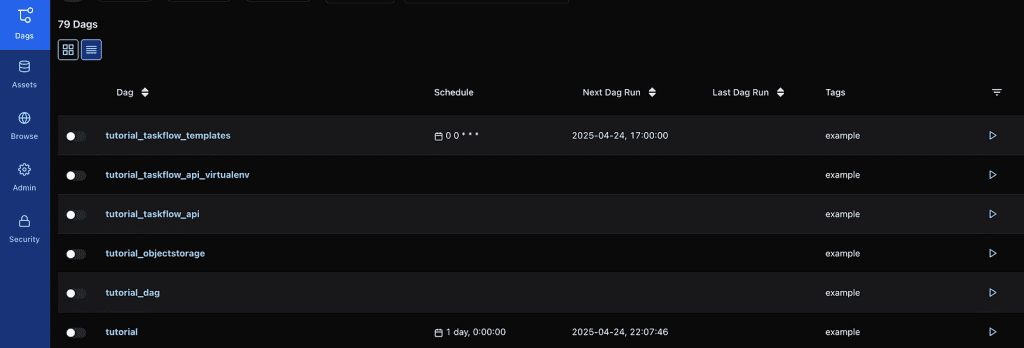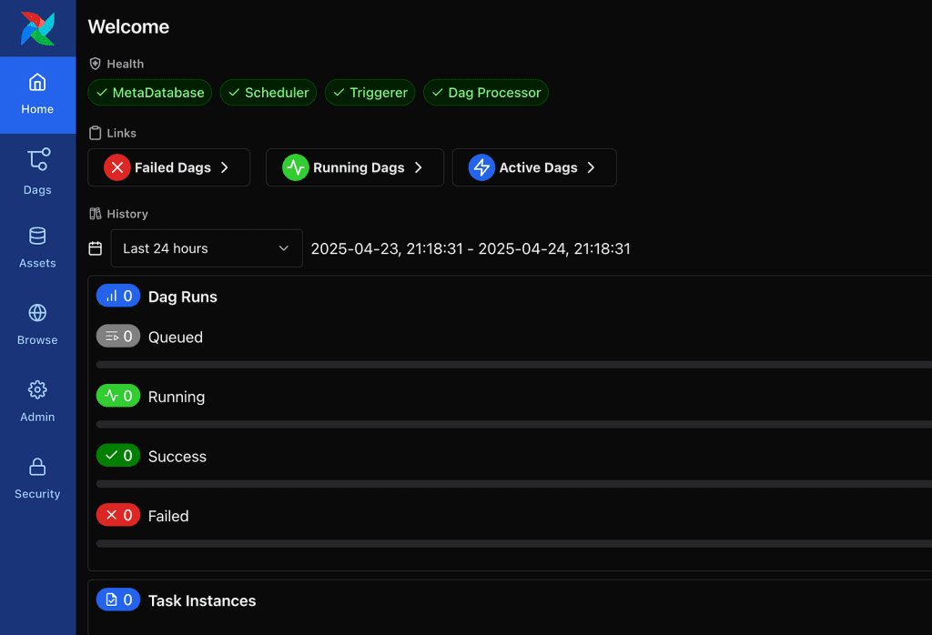 It is now possible to initiate Apache Airflow 3.0. As we have previously experienced, we anticipate that various Airflow components will generate a high volume of terminal outputs. Looks familiar? If you’ve used Airflow before, you’ll feel right at home. 🙂
