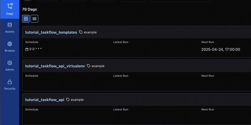 The default view of the DAGs tab is a card view. if you’d prefer more condense view like we have in Airflow 2.x, you can click on the list view