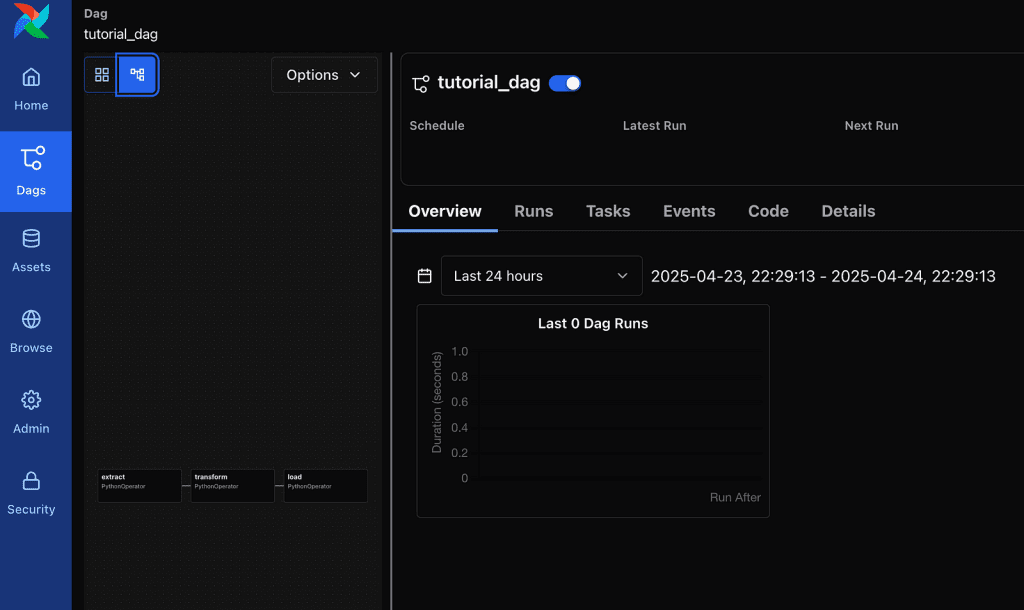 In Apache Airflow 3.0, there are only 2 views left: grid and graph. Personally, I miss the calendar view for getting a high-level sense of DAG completion health without having to wait for the grid view to render all of the tasks’ states in detail.